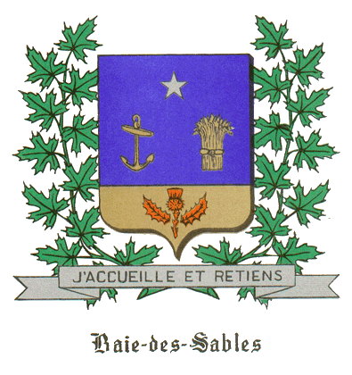 Les armoiries de Baie-des-Sables, telles que réalisées par l’Institut Généalogique Drouin de Montréal, sont une composition harmonieuse de figures et de couleurs qui n’ont pas été choisies au hasard mais qui ont une signification et une origine précises. Par la richesse de leur symbolisme sous la sobriété de leur dessin, ces armoiries constituent en effet un véritable portrait historique et actuel de Baie-des-Sables qu’elles personnifient.